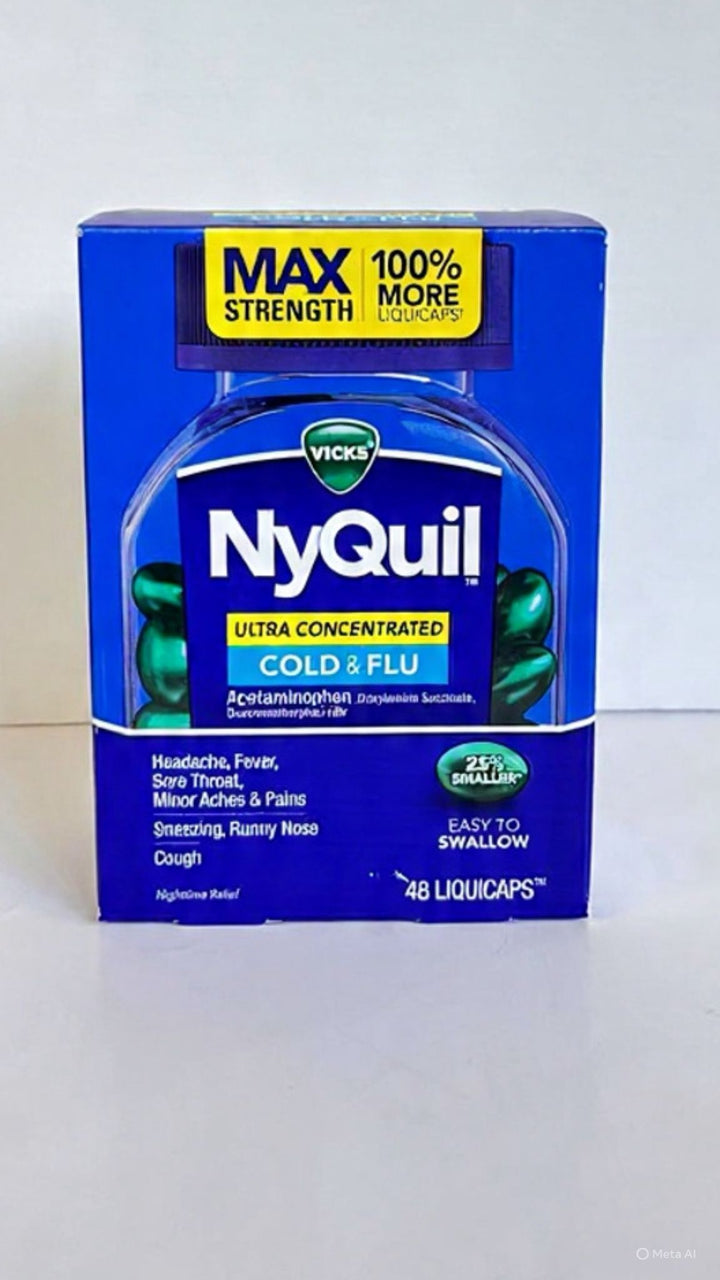 - NyQuil Ultra Concentrado Cold And Flu 48 Liquicaps sirve para ayudar con el alivio diurno y potente de los síntomas de la gripe y el resfriado común, como dolor de cabeza, fiebre, dolor de garganta, dolores menores, congestión nasal y tos, ofreciendo un alivio sin somnolencia para que puedas continuar con tus actividades diarias. Es una medicina multisíntoma potente, en cápsulas más pequeñas y concentradas.